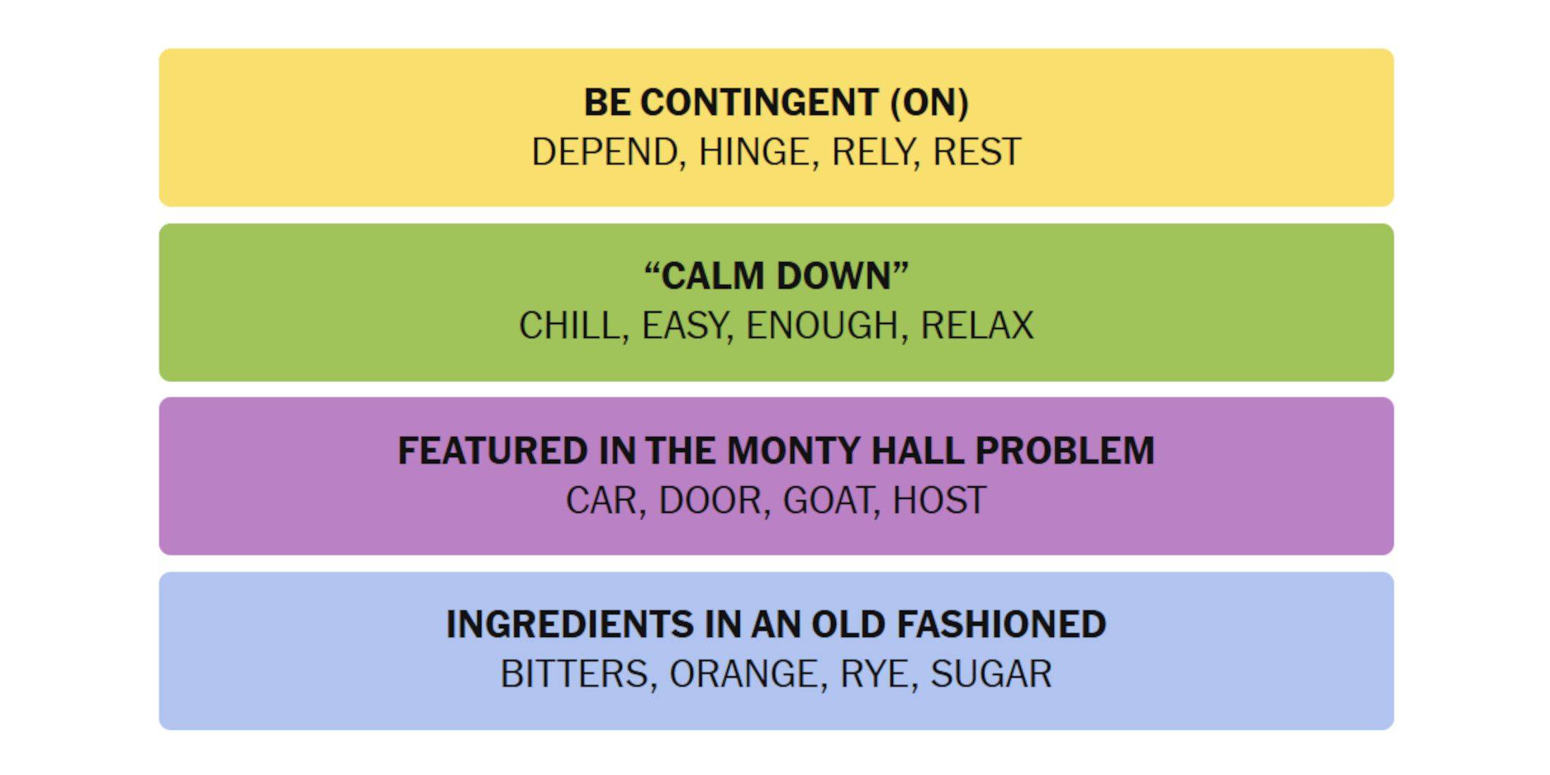 該難題分為四個顏色編碼類別:黃色(易於),綠色(中),藍色(硬)和紫色(棘手)。以下是每個類別的提示和答案。請注意,要維護圖像放置。